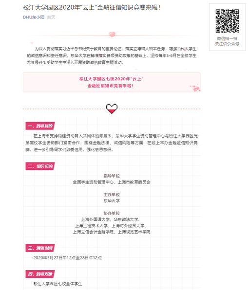 据悉,根据《教育部办公厅关于开展高校学生资助诚信教育主题活动的通知》(教资助厅函〔2013〕1号)精神,我校坚持每年5-6月在全校学生尤其是获奖受助学生中深入开展资助诚信教育主题活动。今年,在疫情防控常态化以及上海市支持构建区域资助育人共同体的背景下,我校与松江大学园区兄弟高校密切合作,创新开展线上主题教育,内容包括金融安全知识微课、不良贷警示片轮播、七校“云上”金融征信知识竞赛、典型案例征集等活动,以期更好的达到增强大学生诚信与责任意识的育人目标。