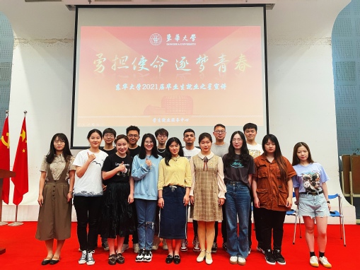 5月25日,2021届毕业生就业之星宣讲活动在松江校区举行,来自14个学院的16位就业之星代表以“勇担使命 逐梦青春”为主题展开宣讲。学生就业服务中心主任严军、团委副书记邵楠出席活动,各学院学生代表参加本次宣讲活动。